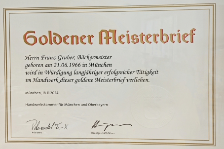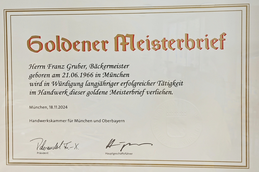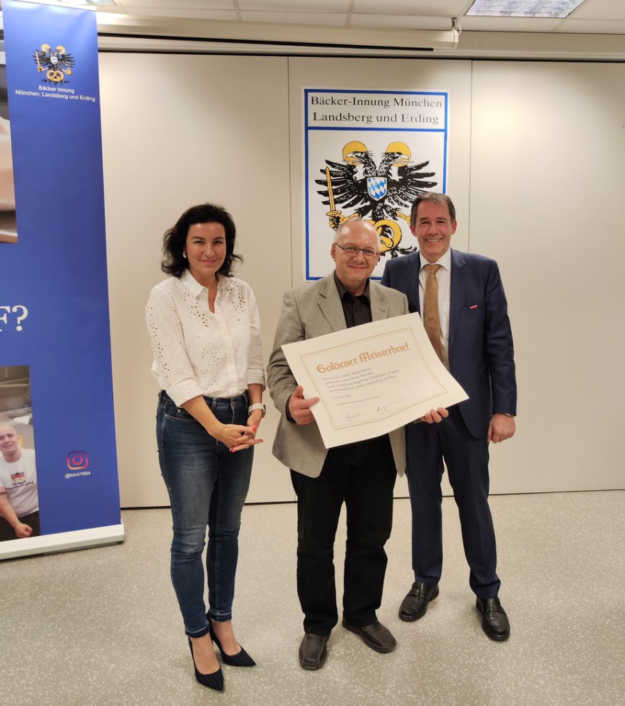 Dafür wurde er 2024 mit dem Goldenen Meisterbrief geehrt - überreicht vom damaligen Landesinnungsmeister des bayerischen Bäckerhandwerks Heinrich Traublinger jun. und Dorothee Bär, Brotbotschafterin
